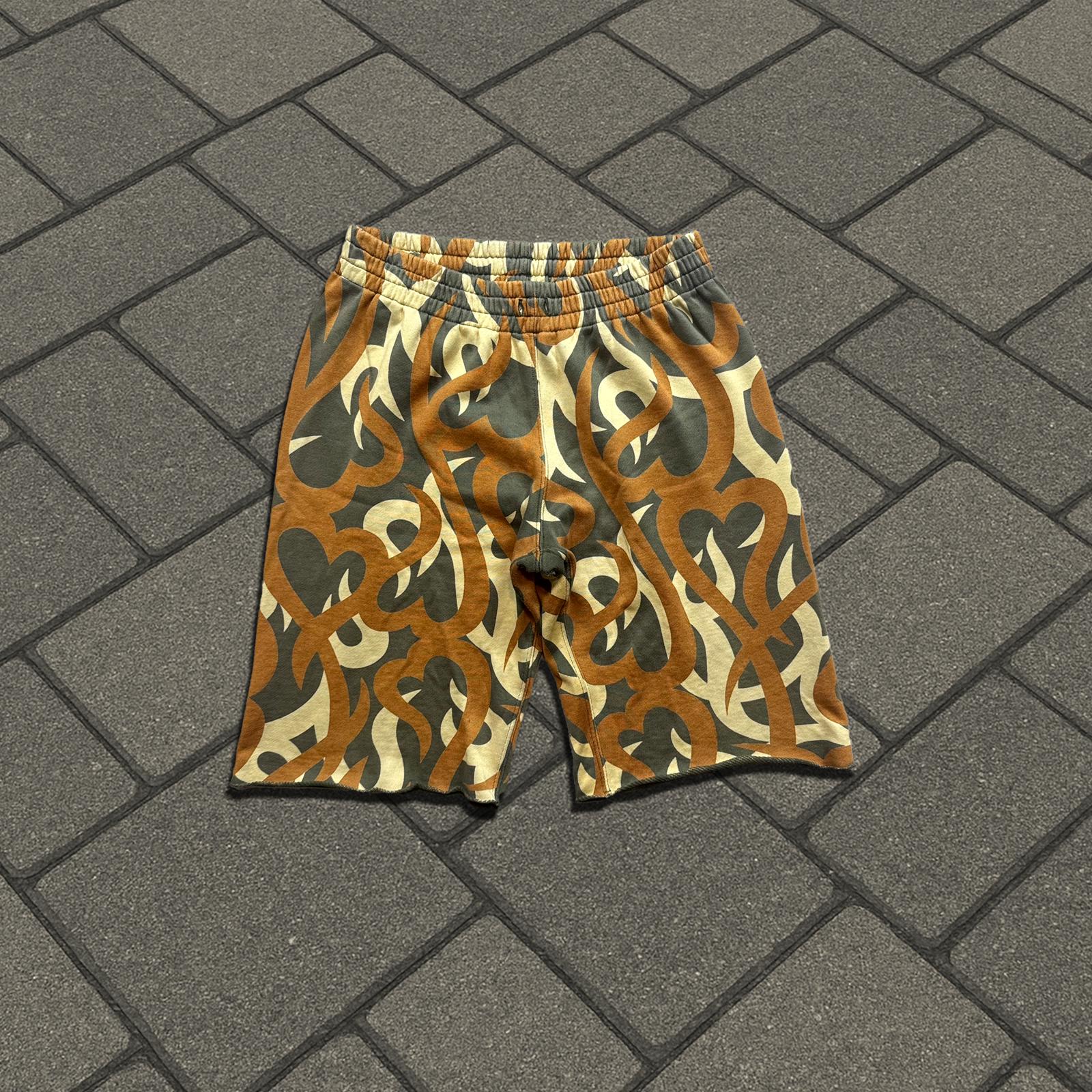 This iconic print from Takahiro Miyahita’s time at Number (N)ine features a camo with hearts in it. Since the runway in 2004 it has become infamous to the brand. Very rare colorway and shorts are impossible to find now. Good condition, No drawstrings and one very small blemish on the back.