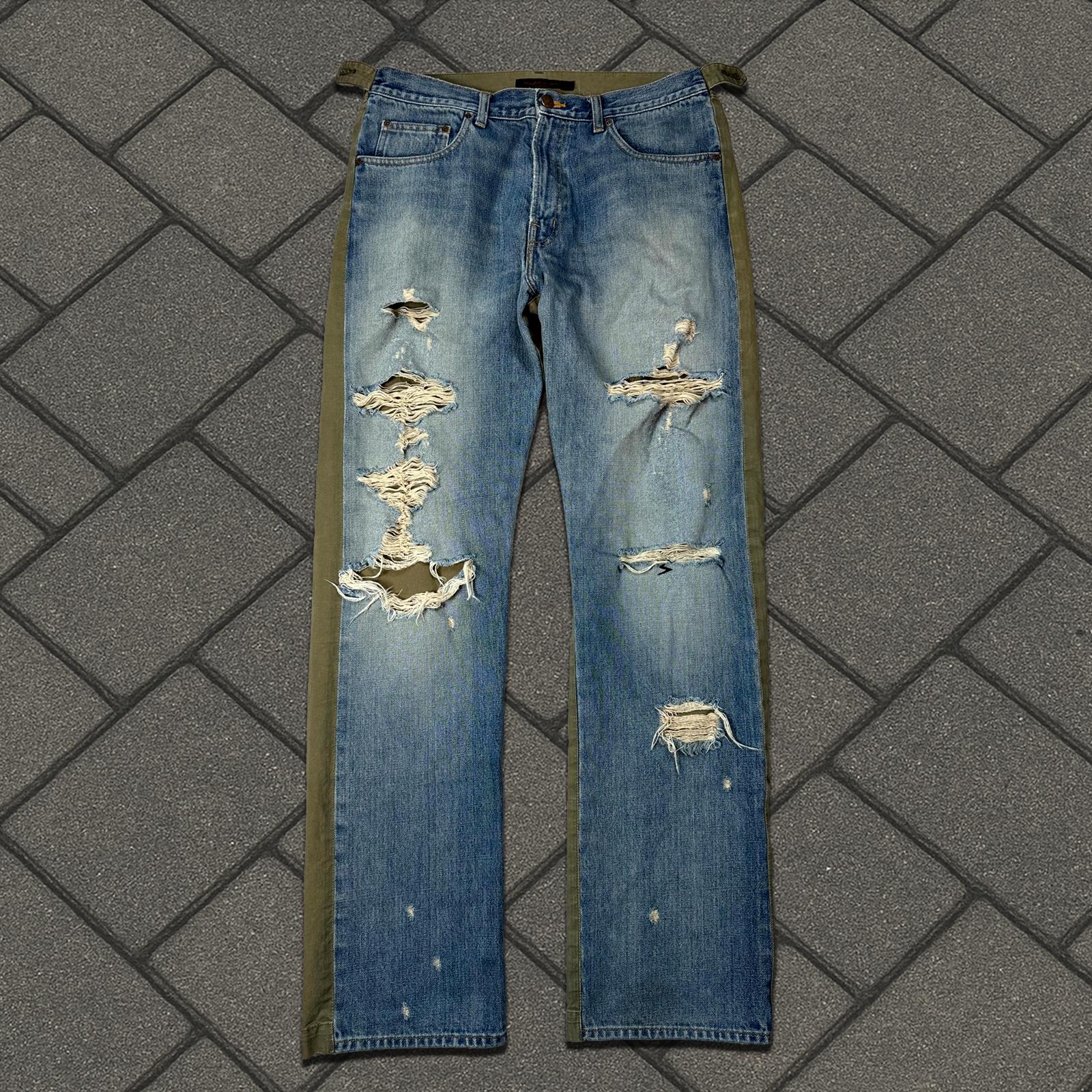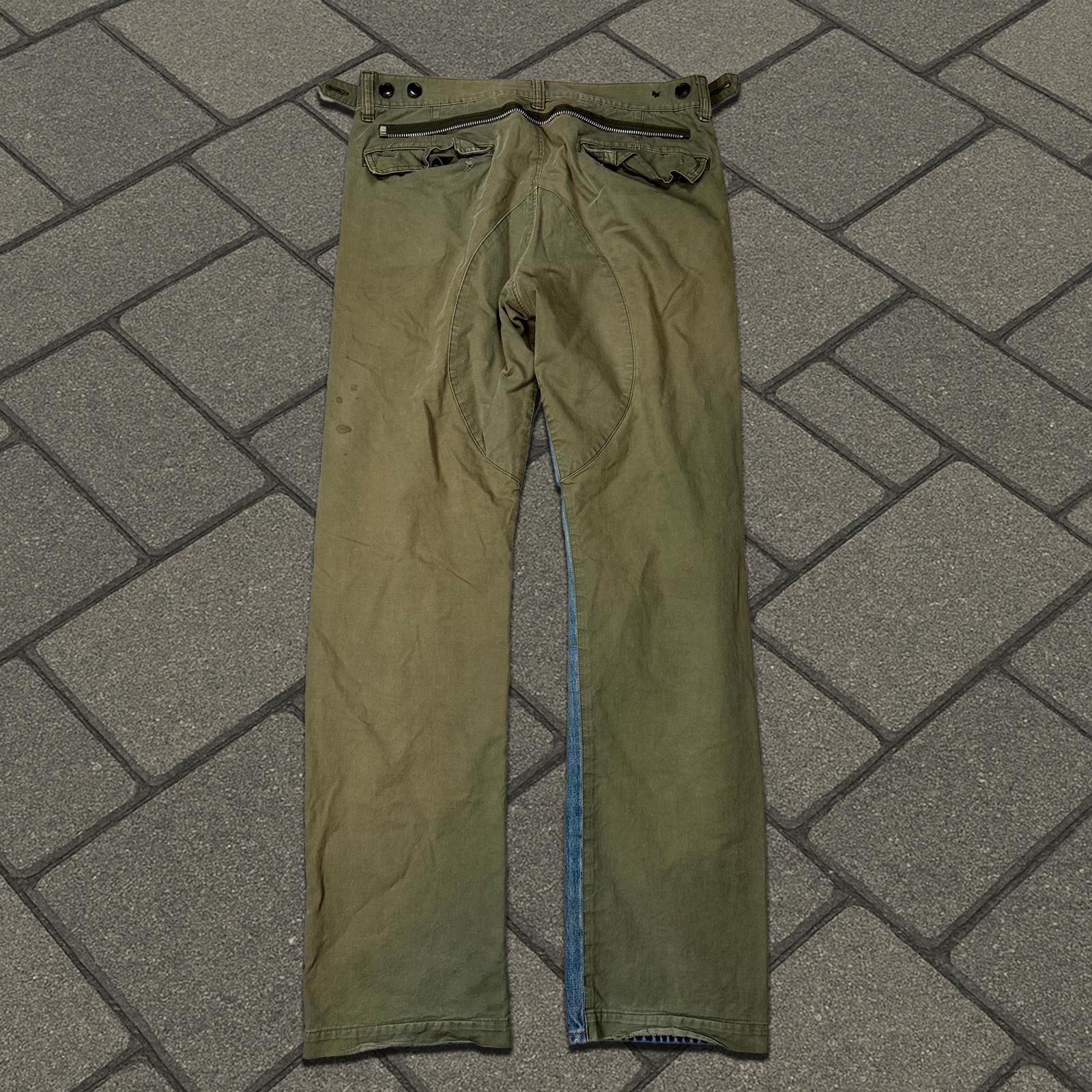 Debuting in Jun Takahashi’s Autumn-Winter 2004 show entitled ’But Beautiful’, this unique pair of hybrids features a cargo/denim mix with distressing on the front and the classic Patti smith lightning bolt. Missing back waist bag and one button on wait adjuster.