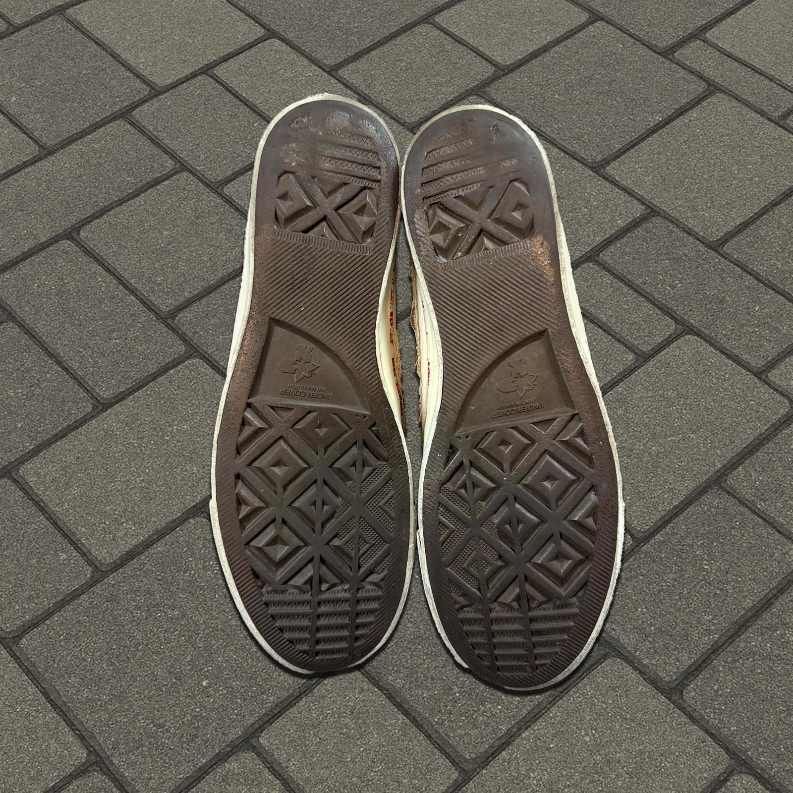 This elite pair of converse from Undercover’s Spring-Summer 2003 ‘Scab’ collection features the classic scab patches throughout the shoe and comes in a rare size L. Took me Years to find in my size one of my favorites in my collection.