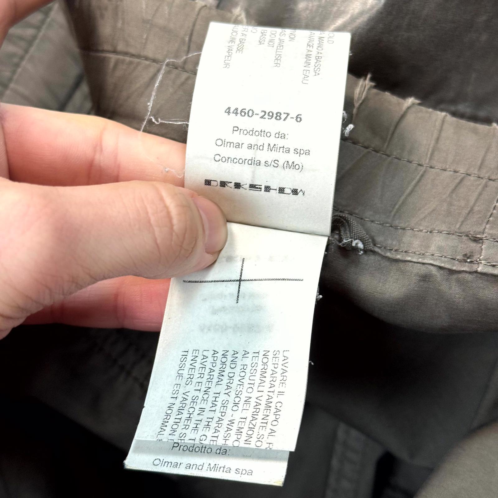 Rick Owens Olmar and Mirta era refers to the early years of his label, produced under the Italian company Olmar and Mirta. This period, spanning the early to mid-2000s, established his signature aesthetic of dark romanticism, elongated silhouettes, and avant-garde tailoring. The pieces from this era are known for their raw, experimental edge and cult status among collectors. It marks a formative chapter in Owens’ evolution as a designer, laying the foundation for his enduring influence on fashion. This piece debuted in his Spring-Summer 2015 show and are used, with the only major flaw being slight tearing at drawstrings.