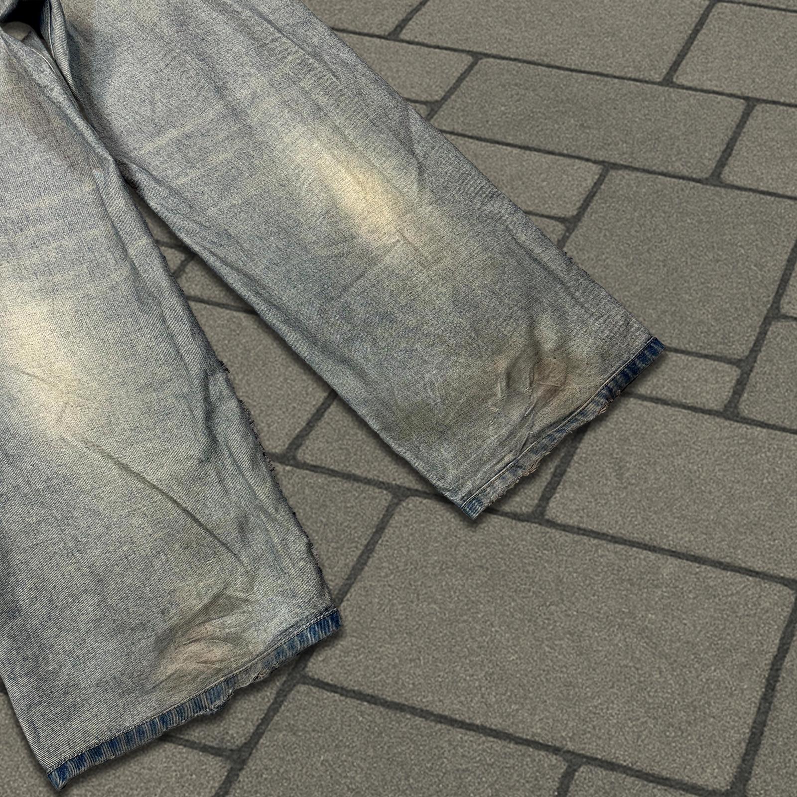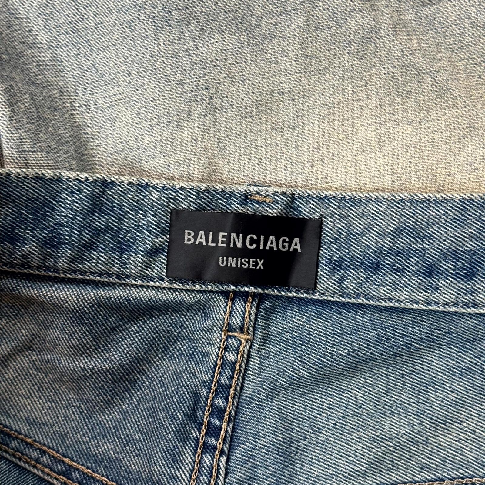 Demna’s tenure at Balenciaga, beginning in 2015, revolutionized the brand with its bold, boundary-pushing designs. Fusing high fashion with elements of streetwear, Demna embraced oversized silhouettes, deconstructed tailoring, and graphic-heavy pieces that challenged traditional notions of luxury. His work at Balenciaga is known for its satirical, often controversial commentary on consumerism and modern culture. Through his vision, Balenciaga became a symbol of progressive, avant-garde fashion that resonates with a global audience. This piece debuted in his Spring-Summer 2024 show. It has a unique look, like the denim has been flipped inside out and an eloquent baggy fit. They are in good condition with minor drag.