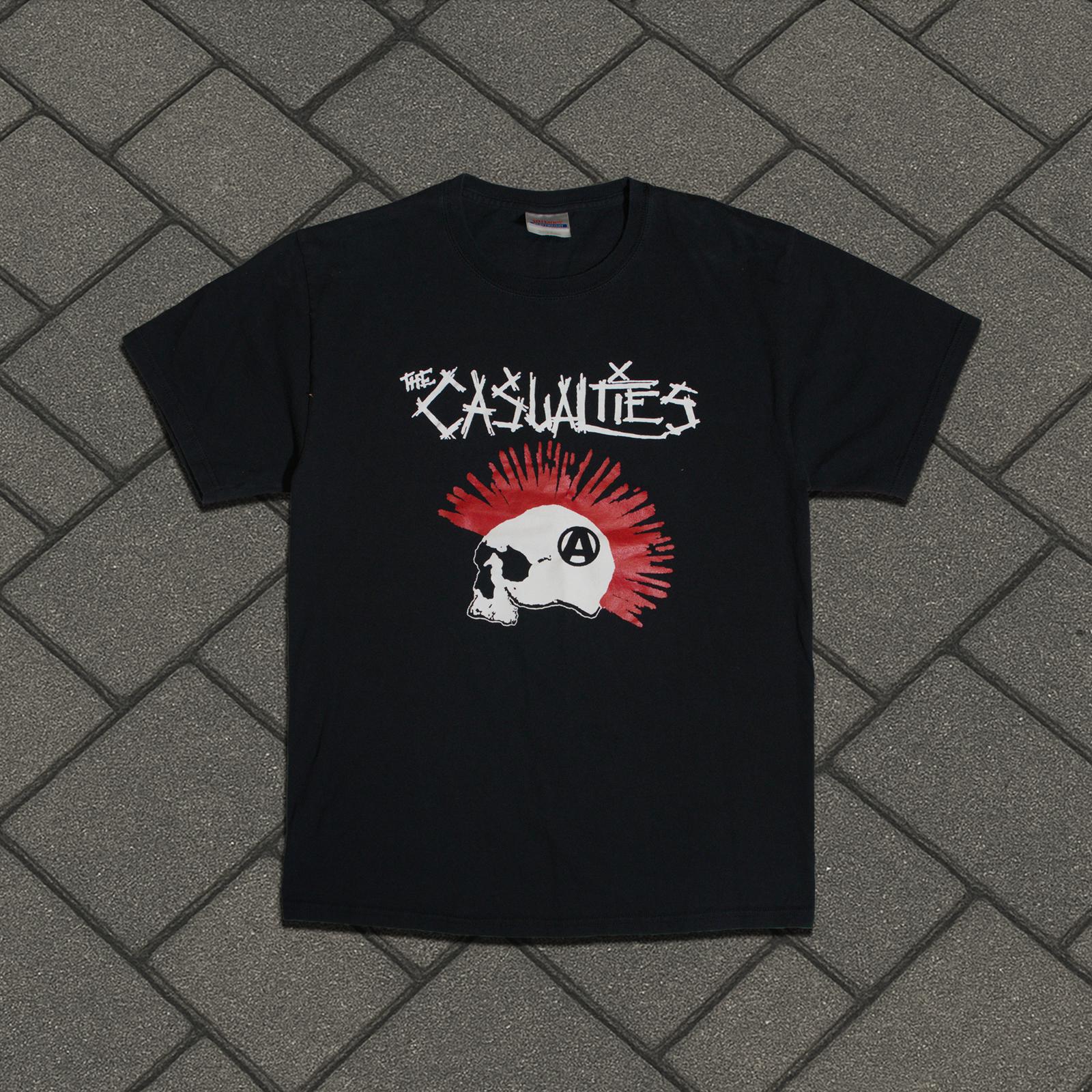The Casualties are a raw New York City street punk band that rose from the Lower East Side in the early 1990s, carrying the sound and fury of classic UK punk into a new era. The core lineup became known as Jorge Herrera on vocals, Jake Kolatis and Rick Lopez on guitars, Meggers on bass, and rotating drummers, all united by chaos, speed, and total disdain for authority. With spiked hair, leather, and beer-soaked anthems, The Casualties built a reputation for violent energy and uncompromising street survival, turning punk shows into riots and rebellion into a way of life. Vintage Band Tee.